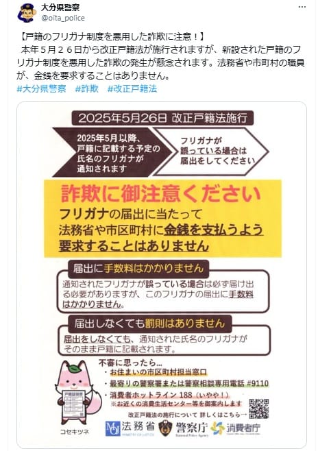 警察庁「戸籍の振り仮名制度を悪用した詐欺に注意!」