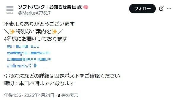 2026年4月から、「平素よりありがとうございます\✨特別なご案内を✨ 4名様にお届けしております プロフィールの固定ポストにまとめています 本日23時まで」という文言で個人のアカウントにメンションを付けた投稿が複数確認されている(例1、例2)。28日時点で、これらのアカウントは「凍結」されている。