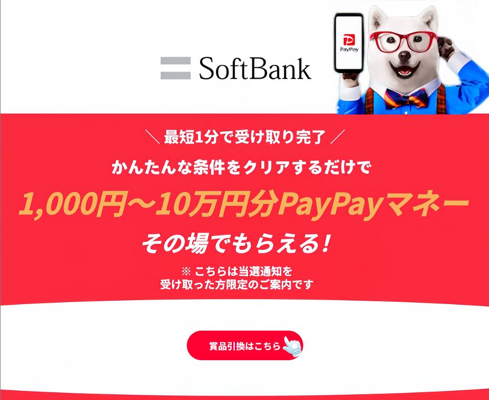 リンクにアクセスすると、Softbankのキャンペーンページのようなサイトにつながる。しかし、「商品引換はこちら」と書かれた場所以外はクリックしても反応しないか、ホーム画面に戻されるだけの偽サイトだ。