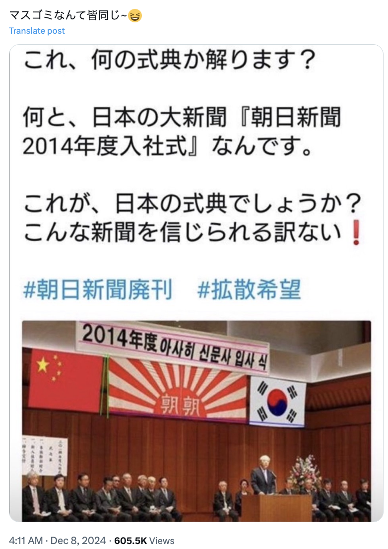 2024年12月8日、「朝日新聞社の2014年度入社式」だとして、社旗の横に韓国と中国の国旗を並べ、式典タイトルをハングル文字にした画像が拡散した。「マスゴミなんて皆同じ」というコメントが付けられている。画像には「これが、日本の式典でしょうか?こんな新聞を信じられる訳ない!」という書き込みも付けられている。