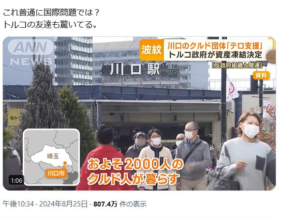 投稿には「ANN NEWS」の字幕が入ったニュースと思われる1分13秒の動画が添付されている。動画には「川口のクルド団体『テロ支援』トルコ政府が資産凍結決定」「クルド人2000人住む川口市 『対応できない』騒動に困惑」のタイトルテロップが入り、以下のようにニュースが読み上げられている。