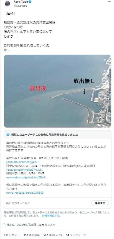 「海の色がとんでも無い事になってしまう......」というコメントとともに、処理水放出の有無で海の色が薄い茶色に変化したとする画像が拡散した。8月25日現在、約37万回の表示回数と235件のリツイートを獲得している。