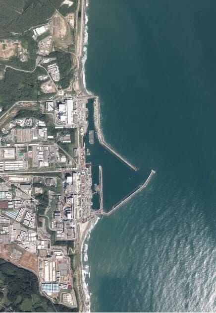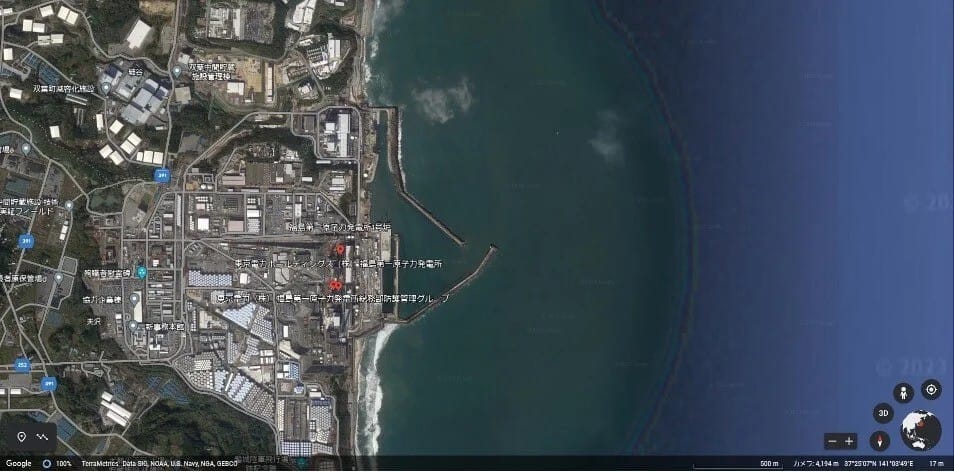 またGoogle Earthで福島第一原発付近の様子を確認すると、この茶色い濁りがわずかにあることがわかる。国土地理院の空中写真(2013年撮影)でも、この濁りに似たものが防波堤付近に見える。