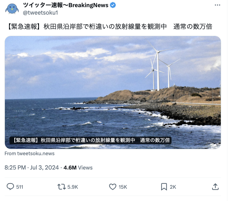 Xの「ツイッター速報」で2024年7月3日夜「秋田県沿岸部で桁違いの放射線量を観測中 通常の数万倍」という言説が拡散した。
