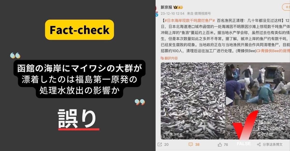 北海道函館市の海岸で大量の魚が死んだことについて、福島第一原発の処理水の影響を指摘する言説が国内外で拡散しましたが、誤りです。北海道ではこれまでにも、急激な水温の変化などで同様の現象が何度も起きています。 検証対象 2023年12月7日、北海道函館市の海岸でイワシやサバなどの群れが大量死した。このニュースが報じられると、海外メディアや国内外のSNSユーザーによる「福島第一原発の汚染水の影響か?」という記事や投稿が拡散した。 中国の大手ソーシャルメディア微博(ウェイボー)では、中国メディア新京報が「魚の死骸が原因不明の理由で打ち上げられた」「地元漁協によると、同様のケースは過去にもあったが、今回のような大量発生は異例」と報道。この報道に対して、「就是核污染水破坏的(核汚染水のせいだ)」「福岛的洋流是往北(福島からの海流が北に向かっている)」などのコメントがつけられている。 ウェイボーでは12月10日のトレンド上位10位にも入った。 別のサイトには、より直接的に「北海道の海岸に大量のイワシの死体、核汚染水の影響か」と報じる中国語の記事もある。日本のテレビ局の