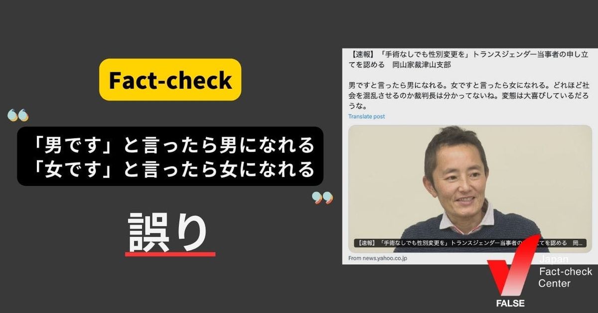 岡山家裁津山支部が性別適合手術を望まない申立人の性別変更を認めたことについて、「男ですと言ったら男になれる。女ですと言ったら女になれる」との言説が拡散しましたが、誤りです。性別変更には複数の条件が必要で、性自認のみで性別の変更はできません。