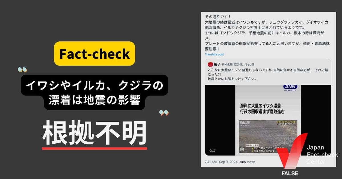 イワシが大量に海岸に漂着しているニュースとともに「地震の影響」といった言説が拡散していますが、根拠不明です。イワシやクジラ、イルカの海岸の漂着と地震を結びつけるデータはありません。