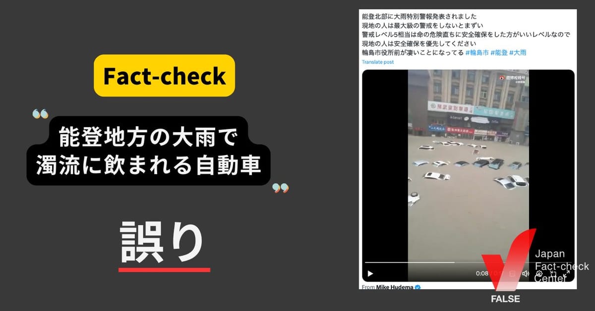 「石川県輪島市役所前が大変なことになっている」という文章とともに、複数の自動車が濁流に飲まれている映像が拡散しましたが、誤りです。動画は、中国河南省で起きた過去の豪雨被害の様子です。