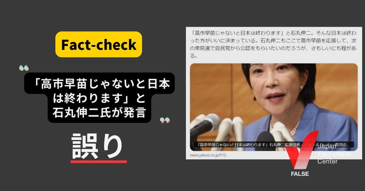 自民党総裁選に関連して「高市早苗じゃないと日本は終わります」と東京都知事選で次点だった元安芸高田市長の石丸伸二氏が発言したとする言説は誤りです。石丸氏ではなく、石丸氏を応援していたドトールコーヒー創業者の鳥羽博道氏の発言です。