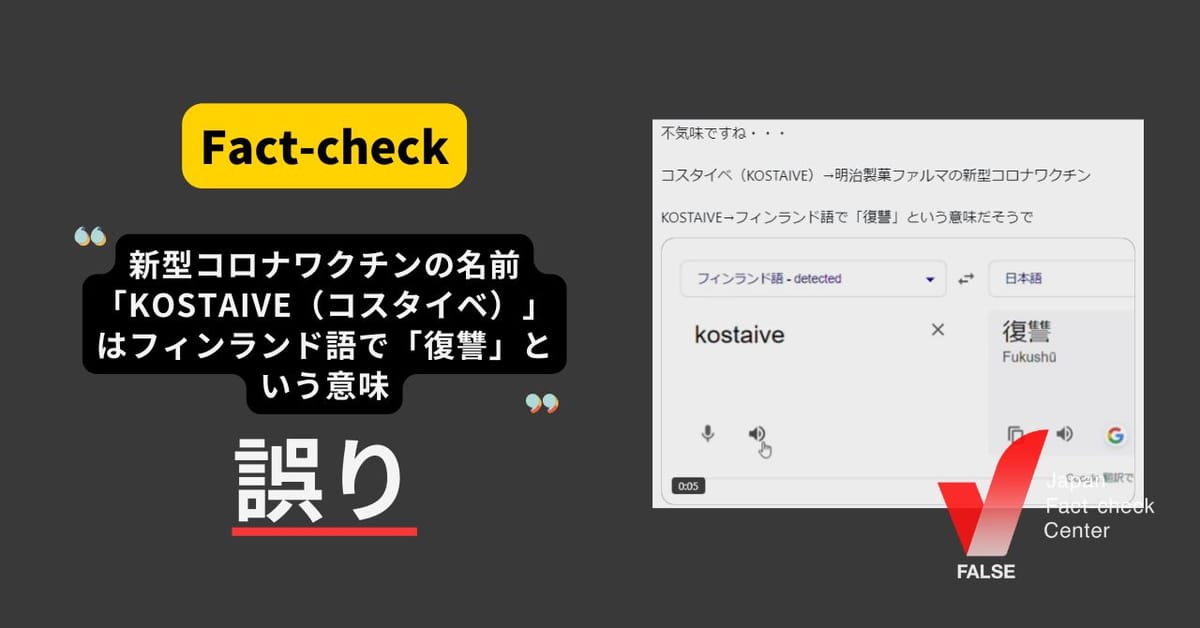 「新型コロナワクチンの名前『KOSTAIVE(コスタイベ)』はフィンランド語で『復讐』という意味」という言説が拡散しましたが、誤りです。フィンランド語に「kostaive」という単語は存在せず、「新型コロナを押さえ込む」という英語が由来です。