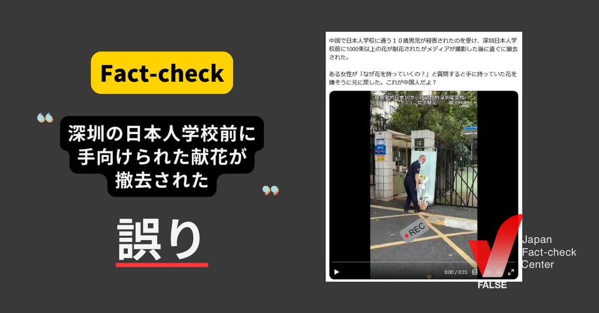 中国・深圳で日本人学校の男子児童が刺殺された事件で、「日本人学校に手向けられた献花が撤去された」との言説が拡散しましたが、誤りです。日本人学校は屋内で献花を保管しています。広州の日本総領事館も学校が気候を考慮して献花室に移動させたと発表しています。
