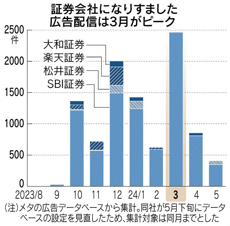 大手証券会社を騙る多数の偽アカウントが2023年8月以降この1年間に、累計で1万件以上の広告をFacebook上で配信していたことがわかったと日本経済新聞が報じました。