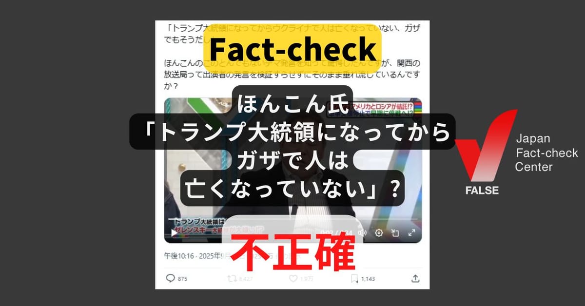 タレントのほんこん氏がテレビ番組で「トランプ大統領になってからガザで人は亡くなっていない」という発言をしましたが、不正確です。放送した日は停戦中でしたが、その期間も人が亡くなっています。