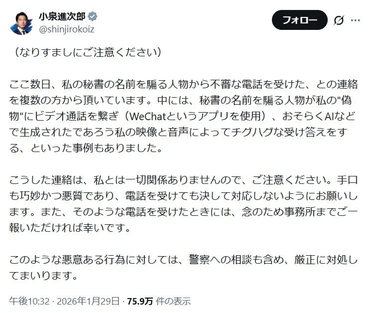 自民党から立候補している小泉進次郎氏は1月29日、Xで、小泉氏の秘書をかたる電話から、チャットアプリへ誘導する事案が複数確認されているとして、注意を呼びかけた。