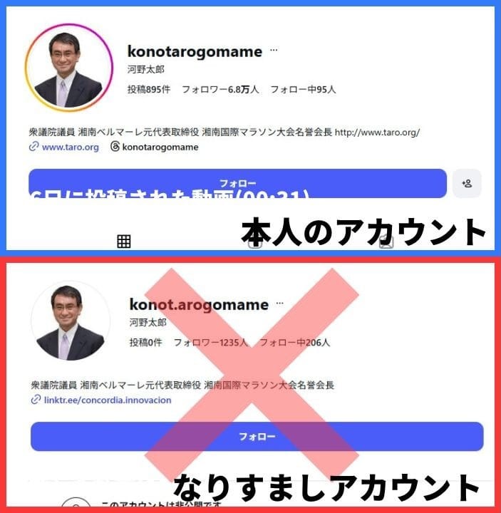 1月31日、自民党から立候補している河野太郎氏は「Instagramに悪質ななりすましが出ました」とXに投稿した。Instagramのなりすましアカウントを確認すると、プロフィール欄は、河野氏の公式Instagramと文言が同じだが、スペイン語のYoutubeやInstagramに誘導するリンクがついている。