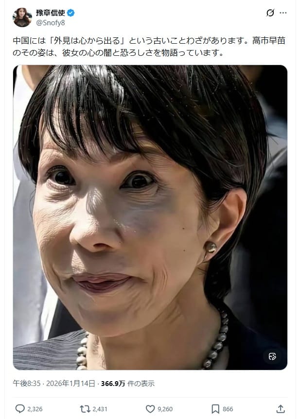 2026年1月14日、「中国には『外見は心から出る』という古いことわざがあります。高市早苗のその姿は、彼女の心の闇と恐ろしさを物語っています」という文言付きの画像がXで拡散した。