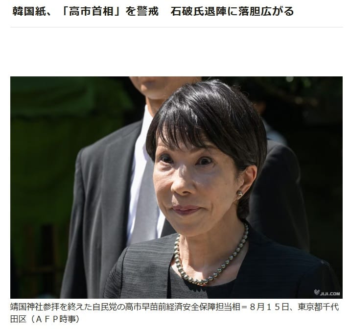 時事通信.”韓国紙、「高市首相」を警戒 石破氏退陣に落胆広がる”.2025年8月15日.