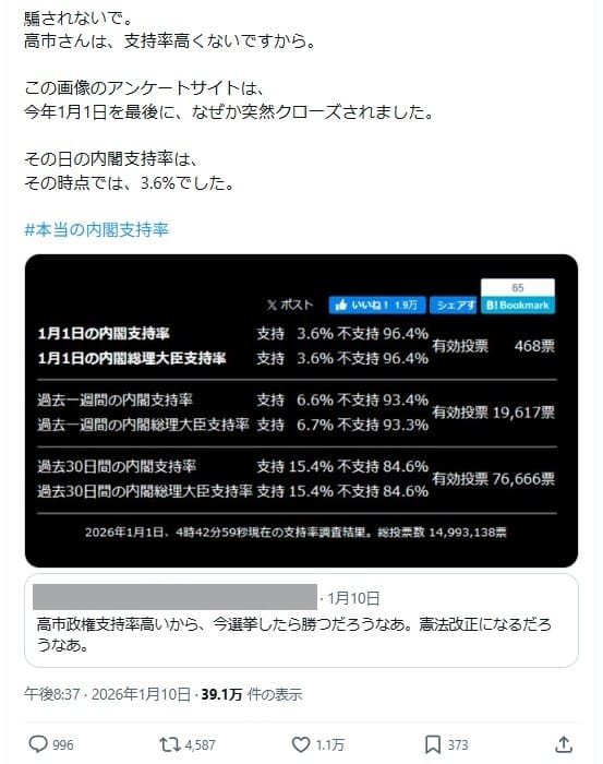 2026年1月10日、「騙されないで。高市さんは、支持率高くないですから。この画像のアンケートサイトは、今年1月1日を最後に、なぜか突然クローズされました。その日の内閣支持率は、その時点では、3.6%でした」という文言付きの画像がXで拡散した。