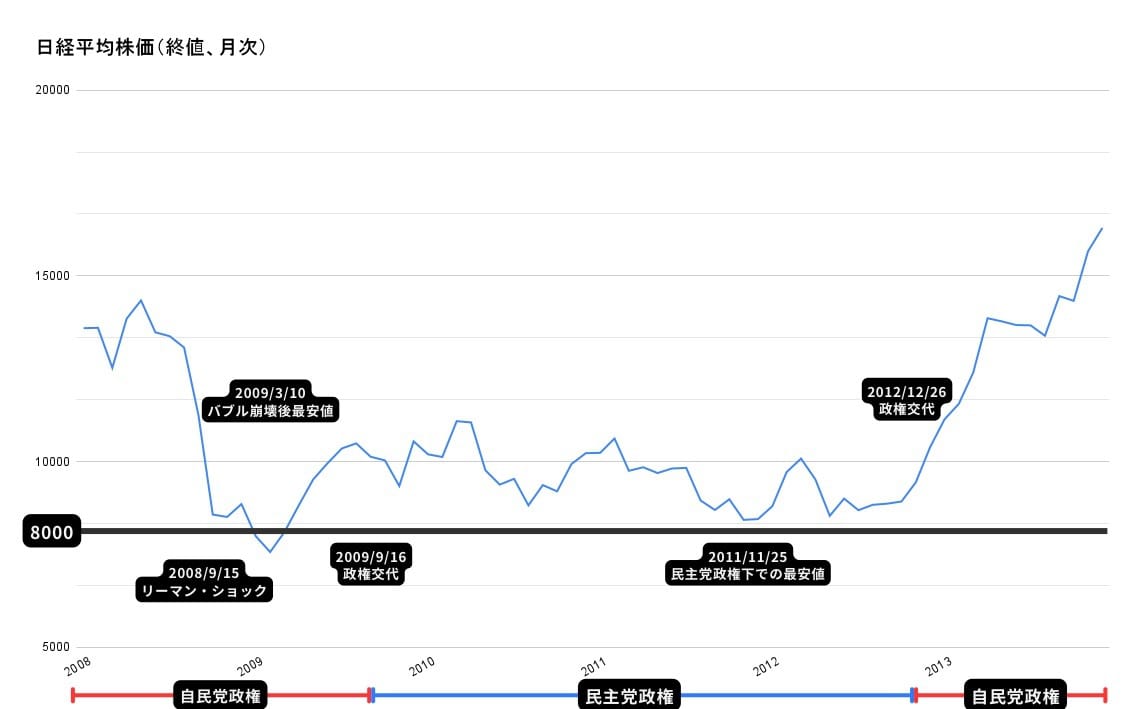 民主党政権時に最も安値を付けたのは2011年11月25日の8135円79銭(取引時間中)だ(日経新聞)。民主党政権下で日経平均株価が8000円を切ったことはない。