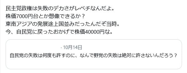2024年10月15日、「民主党政権は失敗のデカさがレベチなんだよ。株価7000円台とか想像できるか?」などと主張する投稿がX(旧Twitter)で拡散した。
