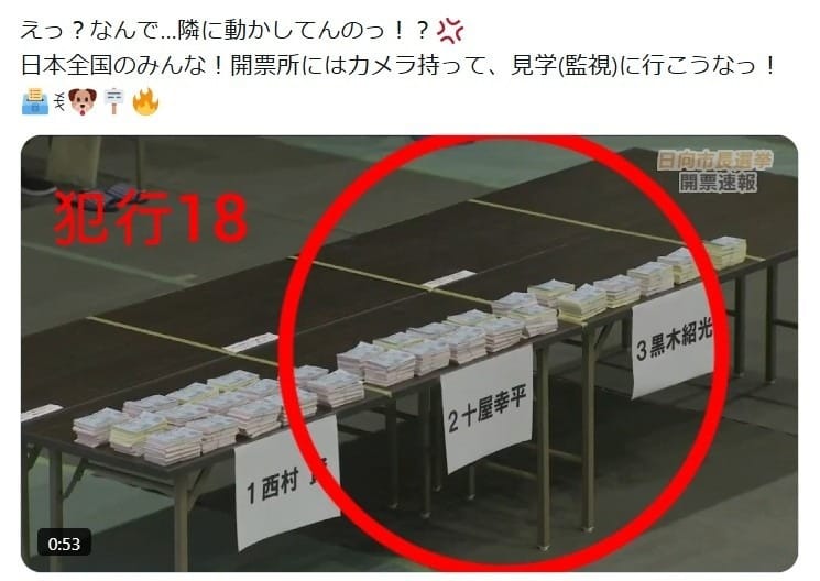 2026年2月8日、開票所の職員が、票の束を動かす映像と共に「えっ?なんで…隣に動かしてんのっ!? 日本全国のみんな!開票所にはカメラ持って、見学(監視)に行こう」とコメントした投稿が拡散した。