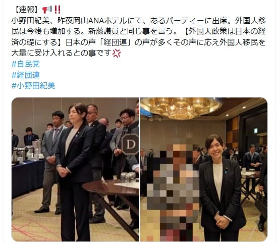 2026年1月25日、小野田氏が「外国人政策は日本の経済の礎にする」「外国人移民を大量に受け入れる」という趣旨の発言をしたという投稿がXで拡散した。