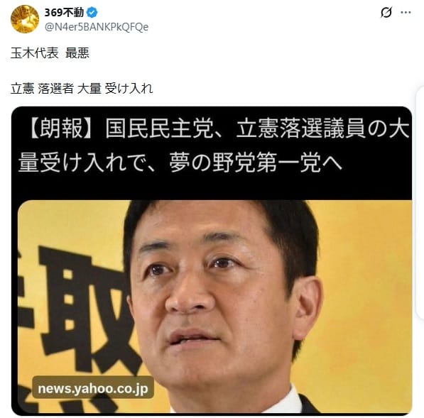 2026年2月17日、「玉木代表 最悪 立憲 落選者 大量 受け入れ」という投稿がXで拡散した。