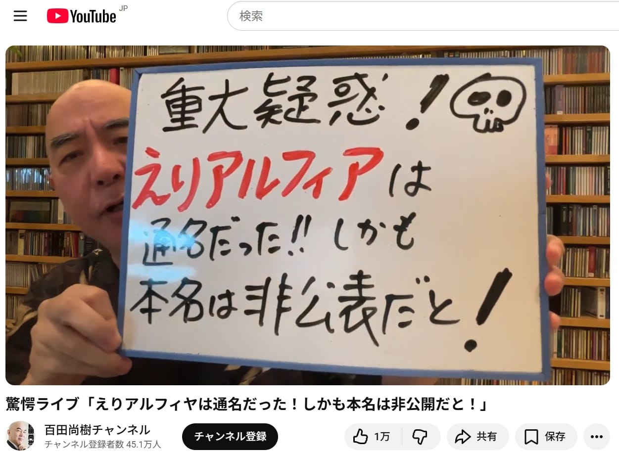 英利氏が本名を隠しているという言説は、これまで度々拡散している(例1,2,3)。「えりアルフィアは通名で本名は非公開」などという内容だ。
