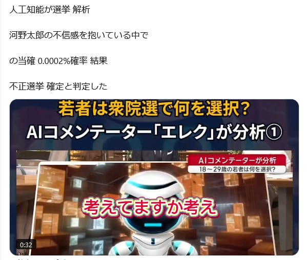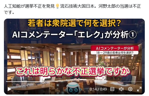 2024年10月29日、テレビ朝日の選挙特番「選挙ステーション」でコメンテーター役を務めたAIが「人工知能が選挙解析 不正選挙 確定と判定した」「人工知能が選挙不正を発見 河野太郎の当選は不正です」などと発言する動画主張する動画が拡散した(例1、例2)。
