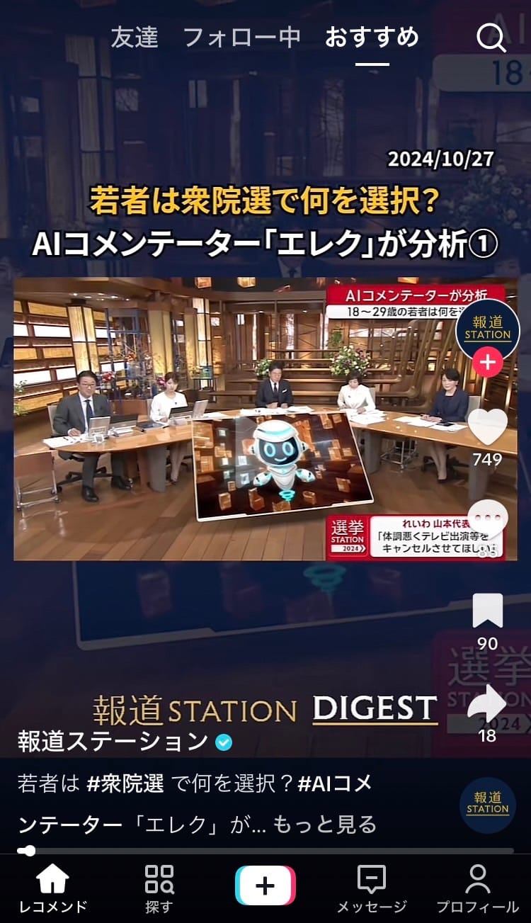 日本ファクトチェックセンター(JFC)が「若者は衆院選で何を選択?AIコメンテーター『エレク』が分析①」の文言で検索すると、報道ステーションの公式アカウントがTikTokに投稿したショート動画がヒットした。動画の下部には「報道STATION DIGEST」の表示がある。