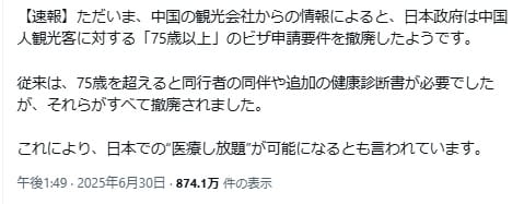 2025年6月30日、「日本政府が中国人観光客に対する75歳以上のビザ申請要件を撤廃した」「従来は、75歳を超えると同行者の同伴や追加の健康診断書が必要でしたが、それらがすべて撤廃されました」という情報がXで拡散した。