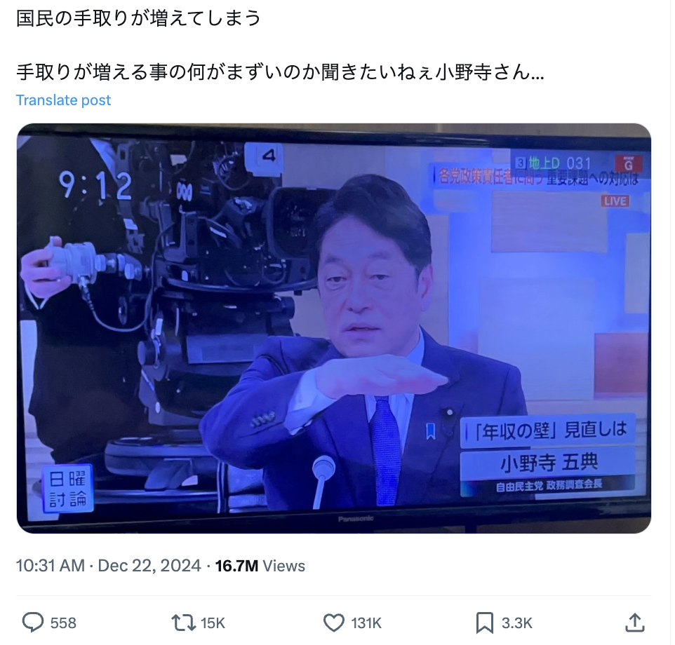 2024年12月22日、自民党の小野寺五典政調会長が「国民の手取りが増えてしまう」と発言したとするポストがXで拡散した。小野寺氏が「年収の壁」問題について発言しているような画像がついているが、内容は画像からは明らかではない。