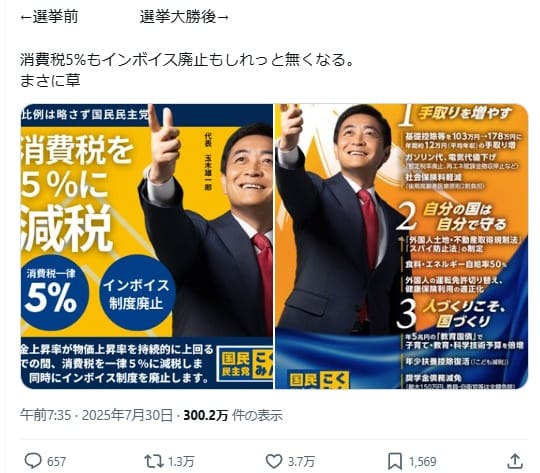 7月30日、国民民主党の政策ポスターを並べ、「消費税5%もインボイス廃止もしれっと無くなる」と記した投稿がXで拡散した。