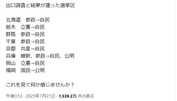 7月20日投開票の参院選の結果が出口調査の結果と異なることから、「選挙で不正があった」と示唆する言説が多数拡散している(例1、2、3)。