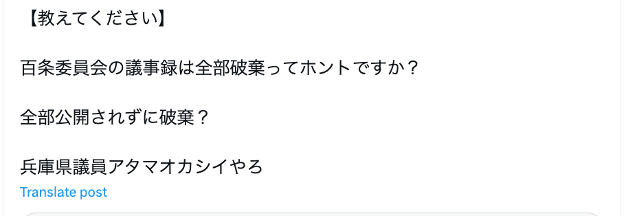 2025年2月18日、兵庫県議会の百条委に関して、「百条委員会の議事録は全部破棄ってホントですか? 全部公開されずに破棄? 兵庫県議員アタマオカシイやろ」という情報が拡散した。