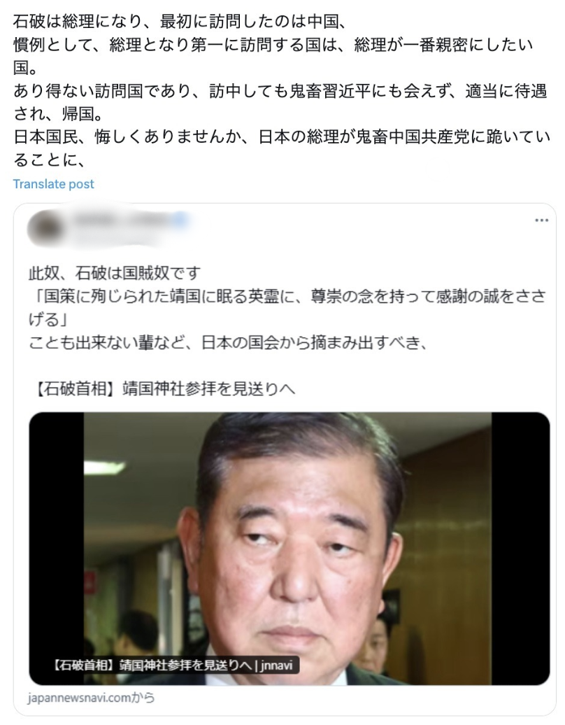 2024年10月12日、「石破は総理になり、最初に訪問したのは中国、慣例として、総理となり第一に訪問する国は、総理が一番親密にしたい国。あり得ない訪問国であり、訪中しても鬼畜習近平にも会えず、適当に待遇され、帰国」というX(旧Twitter)の投稿が拡散した。