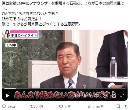 7月1日、党首討論で日本テレビ「news every」に出演した石破首相が、CM中にアナウンサーを恫喝したという動画つきの投稿が拡散した。