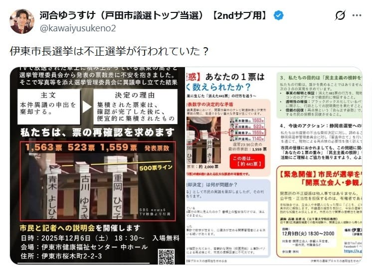 12月15日、「伊東市長選挙は不正選挙が行われていた?」という画像付き投稿が拡散した。画像には、票が積み上げられた画像と共に「TVで放送された卓上に積み上がっている票束の高さと選挙管理委員会から発表の票数差に不安を抱きました」と書かれている。