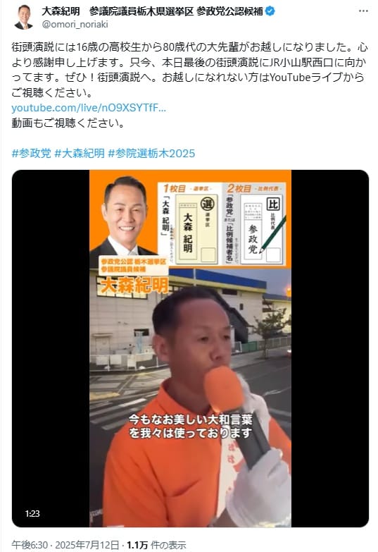 大森紀明 あおぞらチャンネル 参院選栃木選挙区候補者”大森紀明 参院選栃木選挙区 参政党公認候補者 街頭演説inJR小山駅 西口前 ライブ配信!”.https://www.youtube.com/live/nO9XSYTfFN8, 2025/07/12 .(閲覧日2025年7月16日)