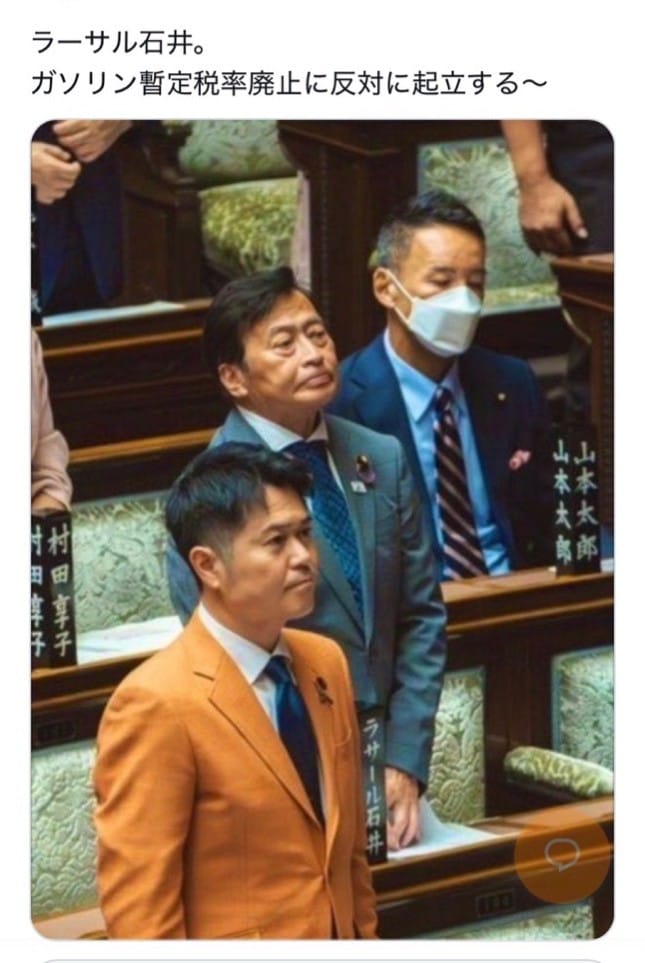 参議院議員・ラサール石井氏が、国会でガソリン暫定税率廃止に反対した、という趣旨の画像が拡散した。8月1日に始まった第218回国会(臨時会)では、参議院で同法案の審議はなく、ラサール氏が所属する社民党もこの内容を否定している。よって、誤りと判定する。