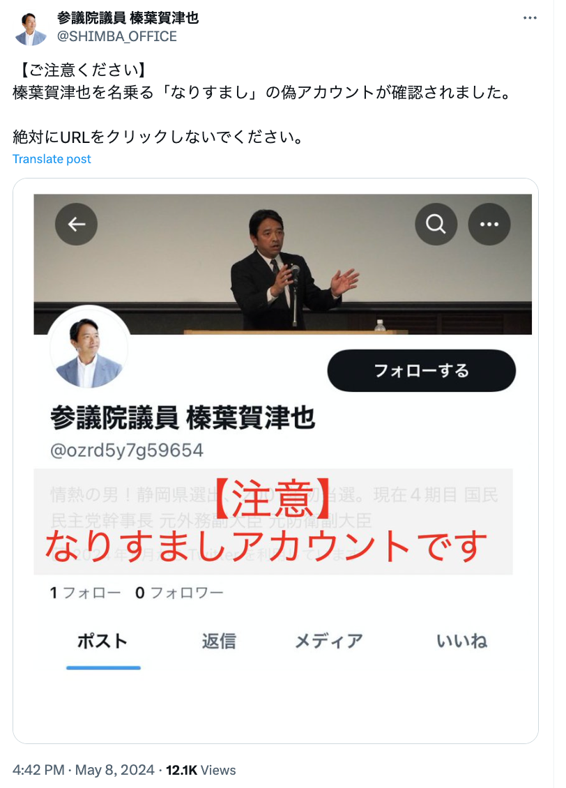 国民民主党の榛葉賀津也幹事長のなりすましアカウントがX(旧Twitter)に現れて、本人が注意を呼びかけています。投資詐欺に誘導されたり、個人情報を抜き取られたりするなどの危険性があります。