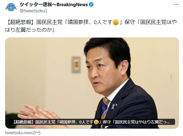 8月17日、Xで「【超絶悲報】国民民主党『靖国参拝、0人です😁』保守『国民民主党はやはり左翼だったのか』」という投稿があった。