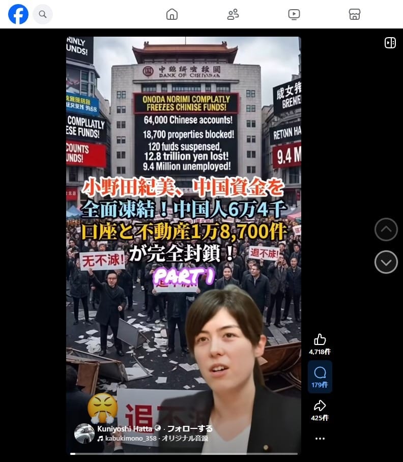 2025年12月、Facebookのリールに「小野田紀美、中国資金を全面凍結、中国人64000口座と不動産18700件が完全封鎖」「実は日本政府は数ヶ月前から中国資本の動きをAIで監視していました。朝日新聞によれば、内閣府、警察庁、防衛省、金融庁までが一体となって動いていたそうです」と語る動画が拡散した。