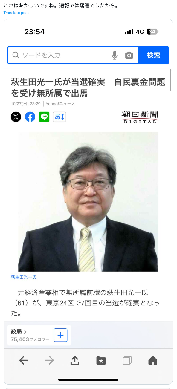 2024年10月27日、衆院選における萩生田光一氏の当選について、「これはおかしいですね。速報では落選でしたから」と、否定するような投稿がX(旧Twitter)で拡散した。