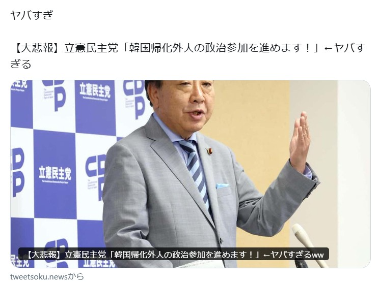 2025年9月1日、「立憲民主党『韓国帰化外人の政治参加を進めます!』」という投稿が拡散した。