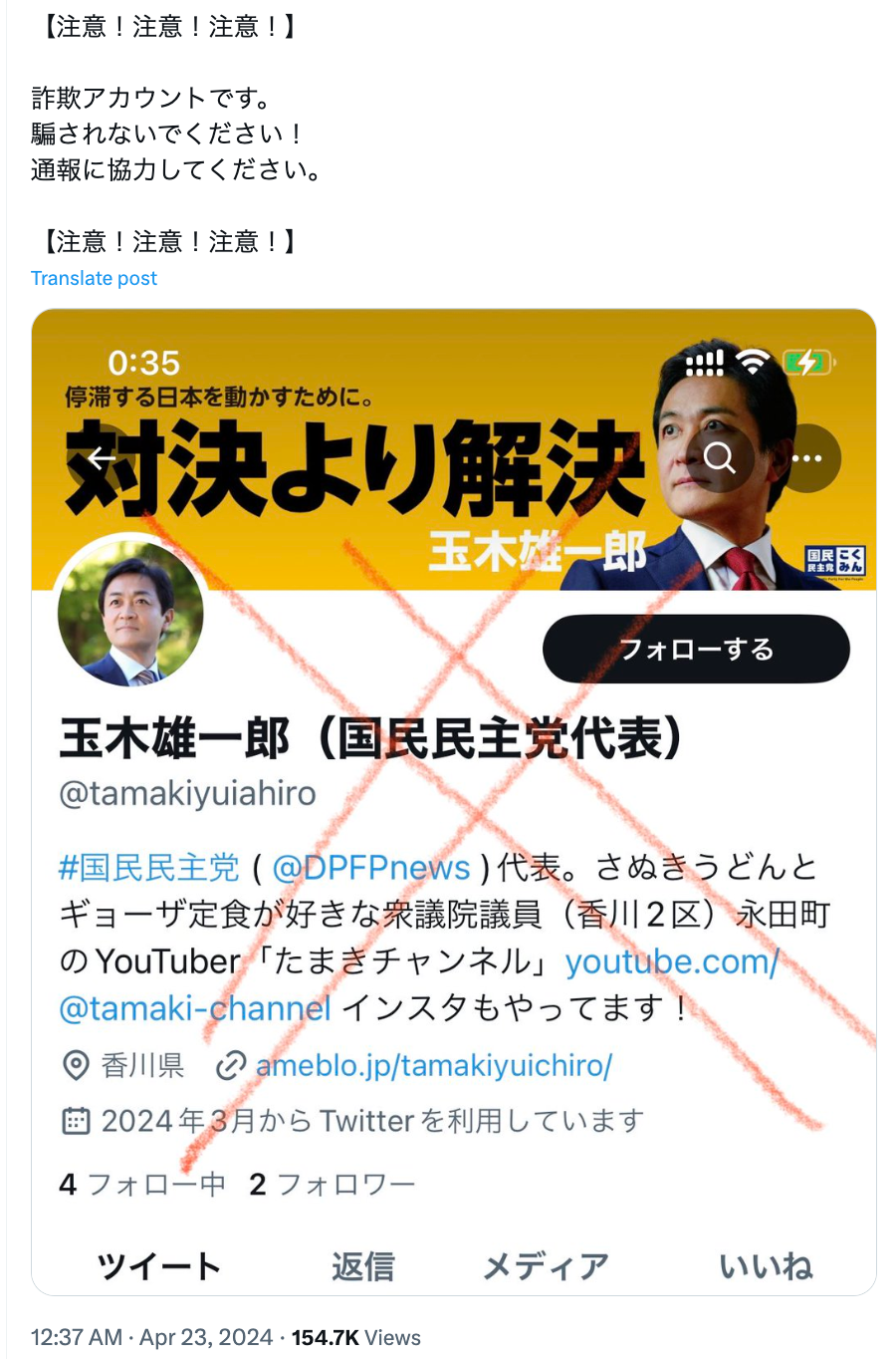 2024年4月23日、玉木代表がXの公式アカウントで、自身のなりすましアカウントが登場しているとしてユーザーに注意を呼びかけた。