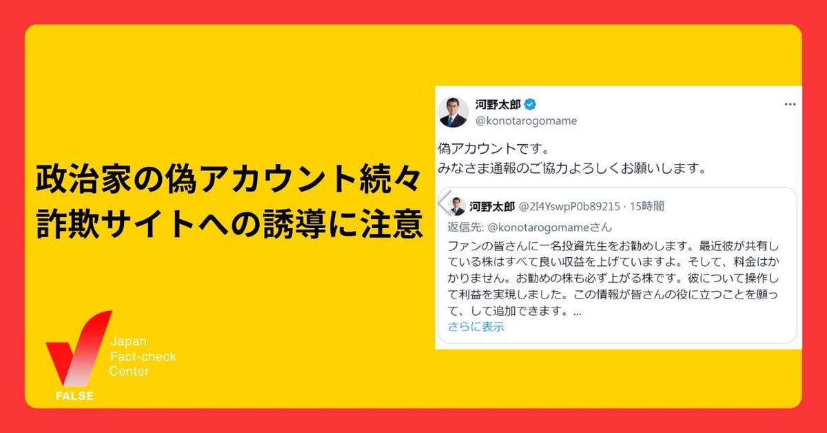 今回、拡散した投稿はすぐに注意喚起をしたため、表紙のみのなりすましで、4月24日時点で、その後の投稿がありません。フォロワーの数やIDをチェックすることを心がけましょう。日本ファクトチェックセンター(JFC)では、これまでも政治家のなりすましアカウントについて記事を出しています。