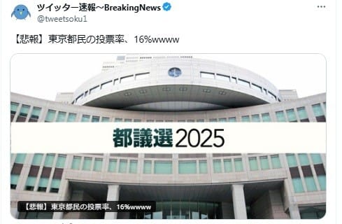 2025年6月22日、「【悲報】東京都民の投票率、16%wwww」という投稿がXで拡散した。