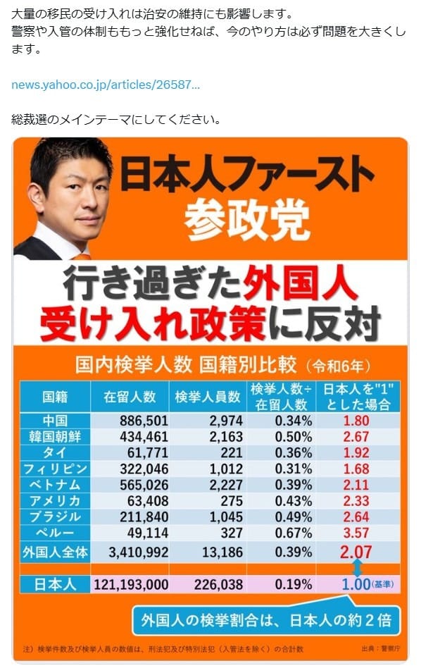 2025年9月20日、神谷氏が「大量の移民の受け入れは治安の維持にも影響します。警察や入管の体制ももっと強化せねば、今のやり方は必ず問題を大きくします」という文言とともに、「外国人の検挙割合は、日本人の約2倍」と書かれた画像を投稿した。