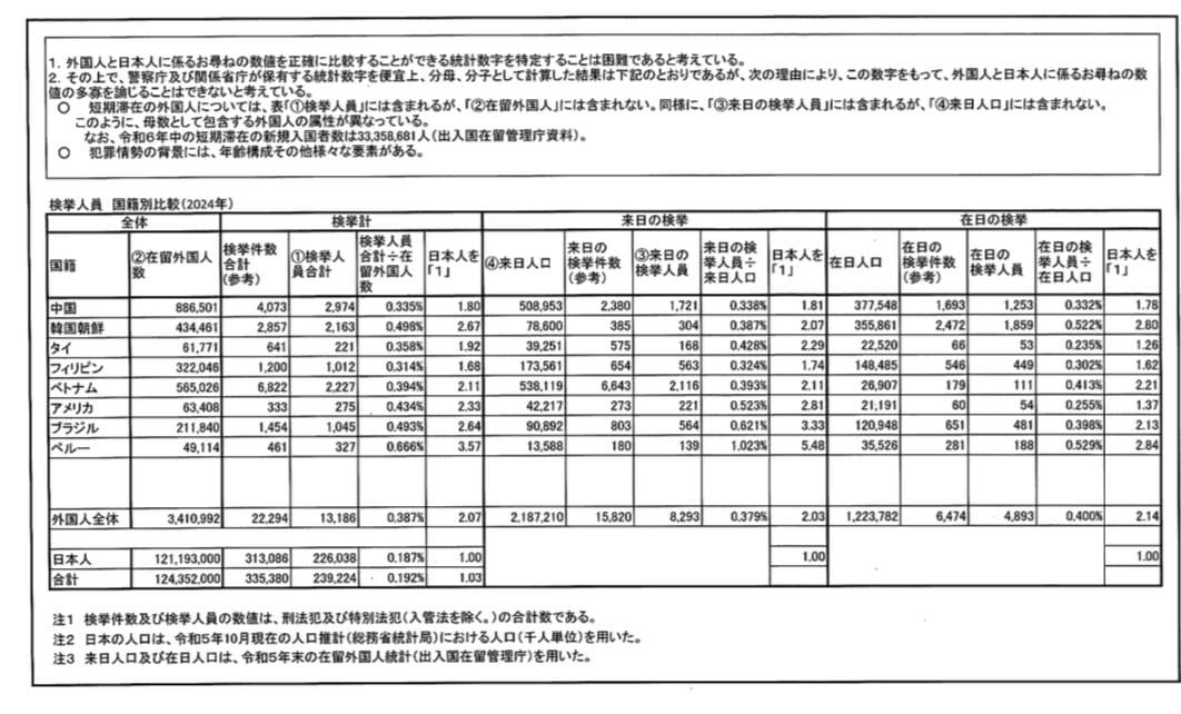 「外国人と日本人に係るお尋ねの数値を正確に比較することができる統計数字を特定することは困難であると考えている」「短期滞在の外国人については、表『①検挙人員合計』には含まれるが、『②在留外国人数』には含まれない」「同様に『③来日の検挙人員』には含まれるが、『④来日人口』には含まれない」